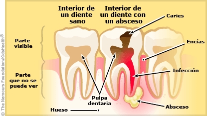 Las bacterias pueden entrar en un diente dañado y causar una infección en el centro del diente, una parte conocida como "pulpa". Para combatir las infecciones, el sistema inmunitario envía glóbulos blancos. Los glóbulos blancos se acumulan y forman pus. El pus se concentra y forma un absceso en el extremo de la raíz dental.